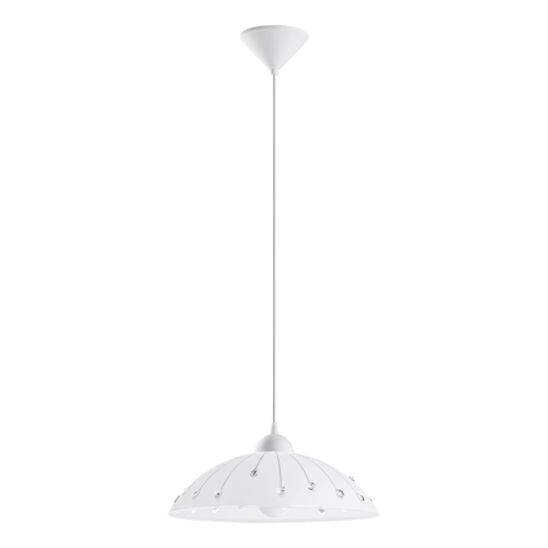 The VETRO pendant light has a round satin glass lampshade in white plastic and a white plastic canopy. The lampshade features a linear pattern and clear glass crystals that complement the elegant design. The pendant light blends seamlessly into traditional cottage-style interiors, providing eye-catching lighting in the kitchen or above the table in the dining room. The pictured milky-white bulb is not included. The product has an E27 lamp holder and requires an E27 lightbulb.