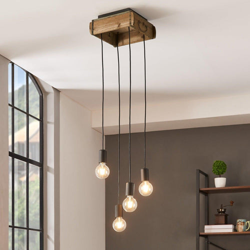 The WOOTTON pendant light has four black metal lamp holders suspended at different heights in a vintage-style square wooden crate. The product features an exposed lightbulb design and a quirky style that complements modern interiors and provides an eye-catching feature in the living room or above the table in the dining room. The pictured filament lightbulbs are not included. The product has E27 lamp holders and requires E27 lightbulbs.