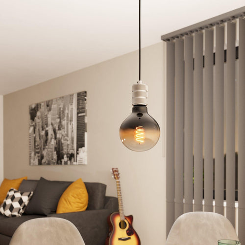 The YORTH pendant light features a ribbed metal lamp holder with a silver finish, black textile cable and a black metal canopy. The pendant light can be paired with different lightbulb styles to blend seamlessly with almost any trend, including vintage, industrial and modern. The minimalist pendant light works well in any living space, whether over the kitchen counter, in the living room, dining room, or above the bedside table. The pictured filament lightbulb is not included. The product has an E27 lamp holder and requires an E27 lightbulb.