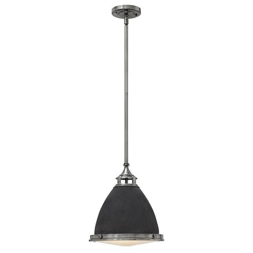 This Hinkley Amelia Aged Zinc Finish Pendant Ceiling Light from Elstead Lighting is a classic art deco pendant with some lovely touches such as the chunky cast metal trim, hinges and clasps in an aged zinc finish. The metal dome shade in black contrasts nicely with the zinc, and is finished with prismatic glass to complete its look.