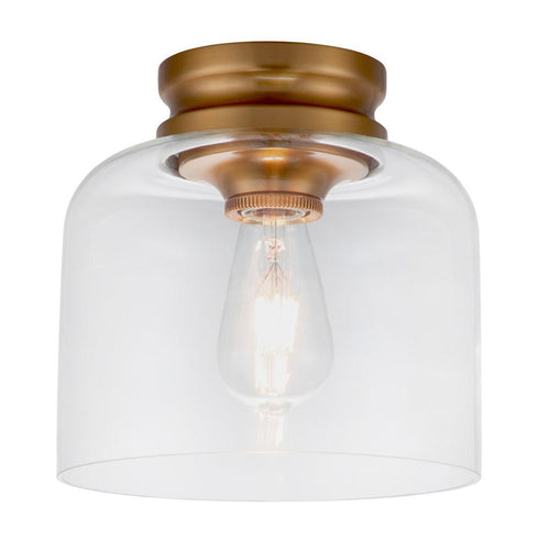 The Hounslow flush fitting is finished in the classic Burnished Brass finish and uses an elongated clear glass dome shade to showcase an interesting filament lamp.