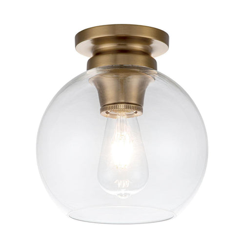 The Tabby flush fitting in Burnished Brass marries an elegant spherical silhouette in clear glass with the on-trend look of exposed lamping.