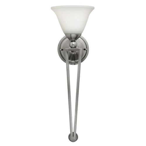 This Hinkley Bolla Brushed Nickel Finish Wall Torchiere from Elstead Lighting has a robust, chunky design with a pair of decorative arms joining the bell-shaped opal glass shade to the wall plate, finished in brushed nickel, with a signature metal sphere adding a lovely extra detail.