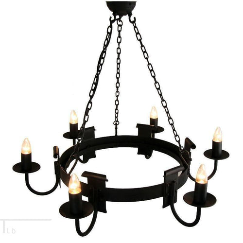 The Chaucer 6 Arm Pendant from Kansa Lighting is a robust, traditional chandelier with a strong Gothic theme, and handmade artisan iron fittings. The Chaucer range also includes a double or single wall light and is available with a choice of black steel or ivory plastic candle drips.
