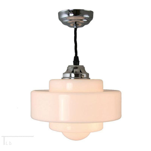 This Small Soda Pendant from Kansa Lighting is a stunning Art Deco design, featuring white opal glass shade with chrome metalwork and black braided textile cable. The Soda range includes a large pendant light and a matching table lamp.