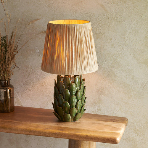 Elevate your home decor with our stunning ceramic table light, inspired by the elegant opening leaves of an artichoke. The rich dark olive reactive glaze adds a touch of luxury, making it a perfect addition to any room. Featuring a stylish brushed aged brass B22 lamp holder and a chic black braided fabric flex, this piece is not only beautiful but also functional. Ideal for your bedroom, this table light creates a warm and inviting atmosphere, perfect for reading your favorite book or unwinding after a long day. Complete the look with our exquisite 32cm Raffia shade, which beautifully complements the design. Shop with confidence knowing that we offer secure delivery, easy returns, and a safe online shopping experience. Illuminate your space with sophistication and style today!