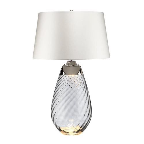 The Lena 2 Light Large Smoke Glass Table Lamp - Off-White Shade features an elegant, swirling glass base with a sophisticated smoke finish, complemented by a sleek, polished metal accent. Its classic white fabric shade diffuses light beautifully, creating a warm and inviting ambiance perfect for any living room or bedroom. Designed to accommodate LED lamp bulbs, this lamp not only enhances your space with its stylish design but also offers energy-efficient lighting solutions. Its timeless appeal and versatile functionality make it an ideal choice for those looking to add a touch of elegance to their home decor.