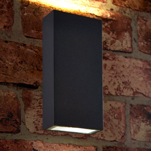 The Morti twin is a premium die cast aluminium LED wall light which features and up and down light wash effect. This fitting provides a high light output of 720 lumens, comes complete with LED driver and is finished in textured anthracite grey paint.