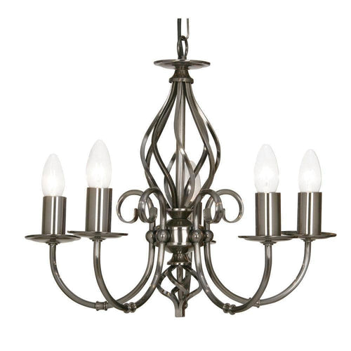 The Tuscany range by Oaks lighting is a simple yet stylish collection of lighting that comes in 4 different finishes. This 5 arm chandelier in Antique Silver finish can be fitted as either a suspension or semi-flush fitting. The small height measurement is the fitting as a semi-flush.