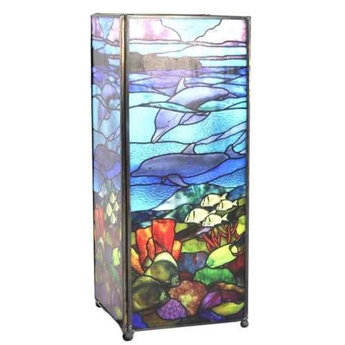 This glass, screen printed lamp has a delightful ocean image with playful dolphins jumping through the waves. It can be used with an energy saving LED lamp.