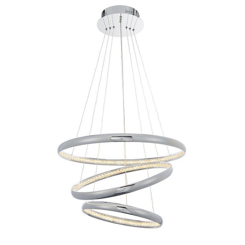 An impressive contemporary multi-hoop LED pendant. Polished chrome concentric circles enclose clear crystals that diffuse the integrated LED light, creating a stunning modern design. Delicately suspended from height adjustable clear cables.