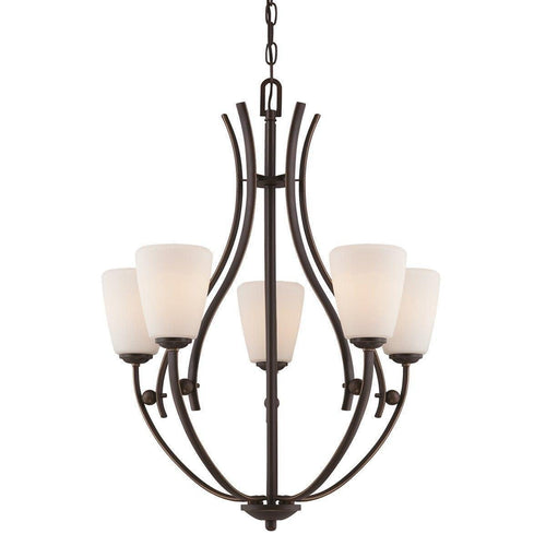 The Quoizel Chantilly Chandelier from Elstead Lighting is a lovely contemporary design that will fit well with most interiors. The Palladian Bronze finish combines with opal etched glass shades with give a soft light which complements the soft curves of the frame.