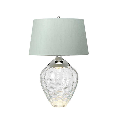 Experience the elegance of the Samara Clear Glass Table Lamp—a sophisticated blend of clear, textured blown glass, polished nickel accents, and a beautifully hand-crafted fabric shade. Designed for both style and versatility, the Samara features a convenient 4-way switch, allowing you to control the shade and glass lighting independently for the perfect ambiance. The base includes a GU10 bulb, while the exquisite Chateau duck egg faux silk shade (ref LSUK003) adds a touch of refined luxury to any space. Shop with confidence from the UK’s leading lighting specialists and enjoy free 90-day UK returns.