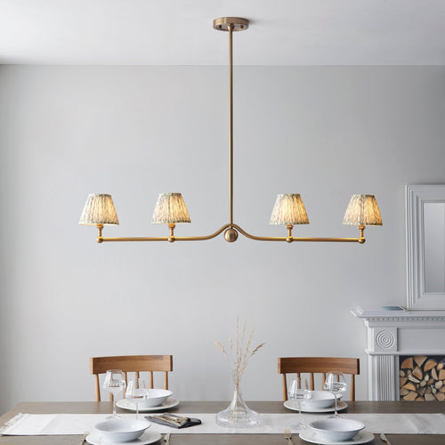 An elegant 4 light classic pendant with multiple stem height options, finished in brushed aged brass and featuring B22 lamp holders for an authentic feel. This unique linear pendant with beautiful sphere detail is best positioned over dining tables; finished with four of our subtle herb green 16cm Leaf shades, helping to create a timeless look.
