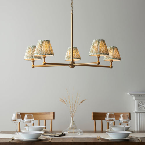Illuminate your space with timeless elegance and sophistication with our exquisite 5-light classic pendant. Designed to captivate and inspire, this stunning fixture features authentic B22 lamp holders, offering a touch of vintage charm that seamlessly blends with modern aesthetics. Crafted with meticulous attention to detail, the pendant boasts a luxurious brushed aged brass finish, exuding warmth and opulence. Its height-adjustable 1.5m chain, adorned with a chic grey braided fabric flex, allows you to customize the perfect ambiance for any room. The pièce de resistance? Our subtle herb green 16cm Leaf shades, which add a refined touch of nature-inspired beauty to complete the look. Plus, for those who value energy efficiency without compromising on style, this pendant is compatible with LED lamp bulbs, ensuring a sustainable and long-lasting glow. Transform your home into a haven of elegance and charm. Elevate your lighting experience today with this captivating pendant.