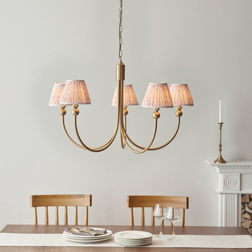 Illuminate your space with timeless elegance and modern flair. Introducing our exquisite 5-light curved arm classic pendant, a masterpiece inspired by the charm of yesteryear, now reimagined for today's discerning tastes. Crafted with a luxurious brushed aged brass finish, this pendant exudes sophistication and warmth, making it the perfect centrepiece for any room. Suspended from a height-adjustable 1.5m chain, it features a chic grey braided fabric flex, adding a touch of contemporary style. The authentic B22 lamp holders enhance its classic appeal, while the option to use energy-efficient LED bulbs ensures a sustainable and brilliant glow. To complete this stunning look, we've adorned it with five of our subtle peachy keen 16cm Leaf shades, casting a soft, inviting light that transforms your home into a haven of comfort and style. Elevate your décor with this captivating blend of classic design and modern innovation. Order now and let your home shine with unparalleled elegance.