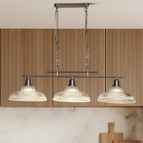 Searchlight Bistro III 3 Light Silver Bar Pendant - Holothane Glass Shades