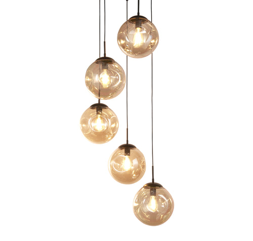 With its concave-shaped champagne glass, the Punch 5 light Multi-Drop Pendant exudes sophistication and elegance, making it a perfect addition to any living room or hallway. Crafted meticulously from durable black metal this 5 light pendant showcases stunning shades made of punched on trend champagne glass that add a touch of refinement to any space. The multi-drop design, featuring shades suspended at varying heights, creates a visually captivating centrepiece, and can be altered to fit the hight of any room.