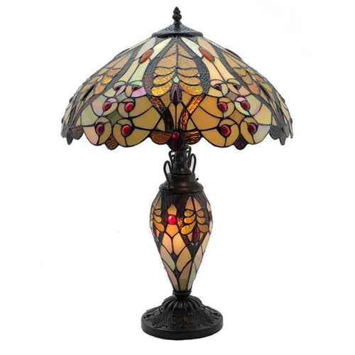 A beautiful double lit Tiffany Lamp that has a stunning art nouveau design. The subtle beige colours will be easy to coordinate in your home. This lamp takes 2 x E27 60W & 1 x E14 40W bulbs.