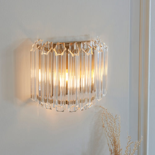 Add a touch of refined luxury to your interior with this stunning clear glass wall light. Designed with faceted vertical glass rods set in a sleek metal frame, it diffuses light beautifully to create a warm, ambient glow. The geometric silhouette brings a sophisticated edge, making it an ideal choice for elevating hallways, living rooms, or bedrooms. Both glamorous and timeless, this wall light serves as a decorative statement piece while delivering elegant, atmospheric illumination.