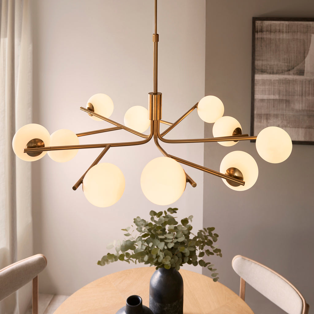 The Aaron Brass 10 Light Adjustable Pendant is an exceptional piece that combines mid-century modern style with functional versatility. It features ten beautifully crafted opal glass spheres, each adjustable to customise the lighting effect according to your space. The brushed aged brass plating delivers a warm, sophisticated finish, complementing a wide range of interior styles. Its height-adjustable telescopic stem ensures optimal placement in any room, while compatibility with G9 LED lamps offers energy-efficient, dimmable illumination. This pendant light is ideal for creating an elegant, ambient atmosphere in living rooms, dining areas, or contemporary commercial settings.