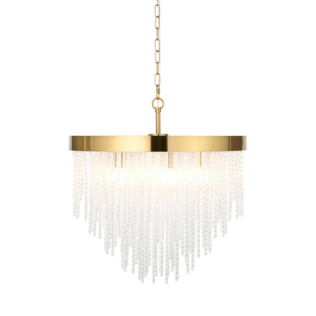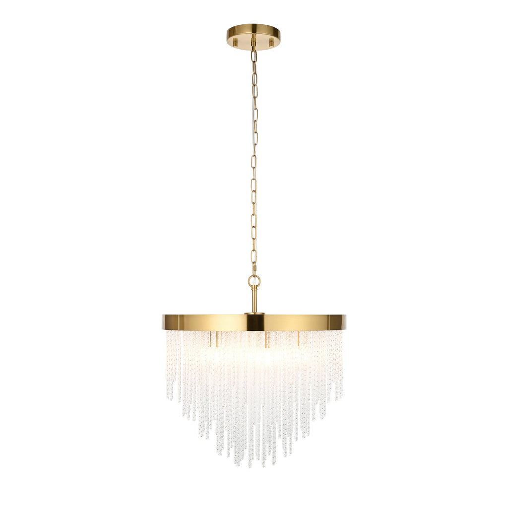 Add a touch of opulence to your home with this 5-light E14 ceiling pendant. Featuring a warm brass-finished frame and an elegant arrangement of elongated, textured glass rods, this statement piece creates a dazzling cascade of light. The tiered design adds depth and sophistication, making it ideal for dining rooms, lounges and bedrooms, delivering both ambient illumination and refined style in equal measure.