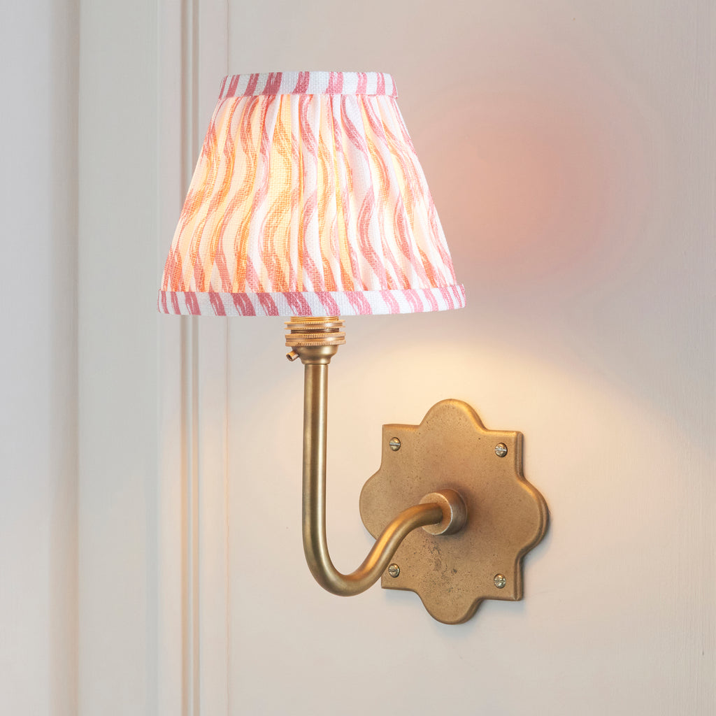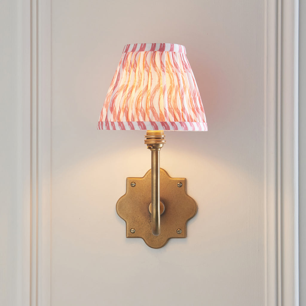 Add timeless character to your space with this single B22 wall light, featuring a beautifully sand-cast decorative backplate in a quatrefoil silhouette. The gently curved brass arm supports a classic tapered soft pleated fabric shade, with coral pink ripple pattern. Ideal for hallways, bedrooms, or living areas, this wall sconce blends traditional craftsmanship with understated sophistication.