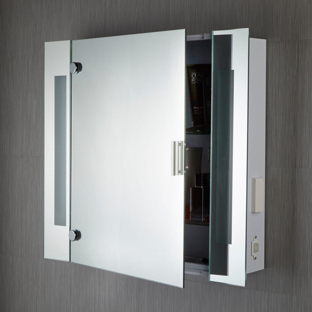 Enhance your bathroom's elegance with the Bathroom Mirror Light - Illuminated Mirror Glass Cabinet. This stunning mirrored cabinet features integrated lighting, boasting vertical light panels flanking both sides of the mirror for a sleek and modern aesthetic. The rectangular lights, set behind frosted glass, gently diffuse illumination for a soft, even glow that transforms your space. With the cabinet door slightly ajar, discover ample storage on the interior shelves, perfect for organizing your essentials. This sophisticated piece requires 1 x LED 9.6W (Cool White) bulb, offering a contemporary lighting solution that embraces minimalist luxury and elevates your bathroom's style, making it ideal for any modern setting.