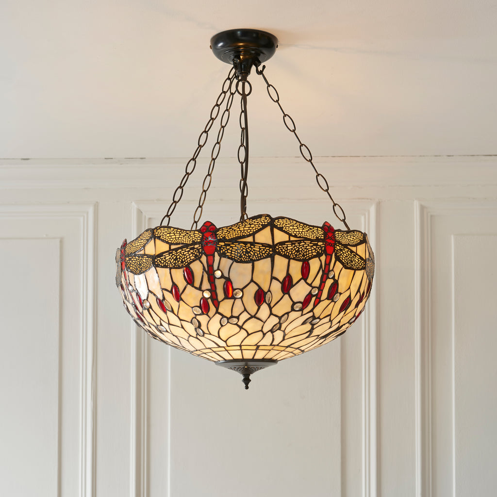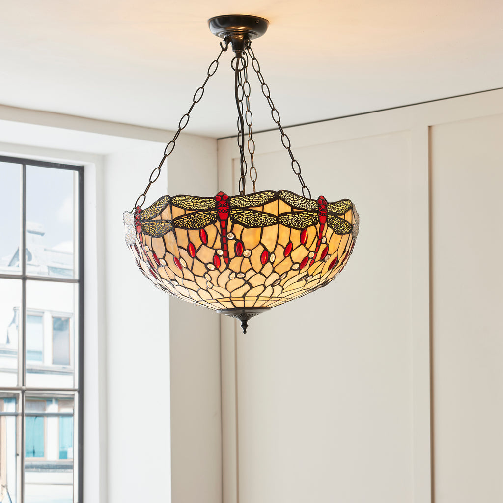 The dragonfly is probably the most famous Lamp available today and we have the largest choice available. The rich ivory tones of the beige Dragonfly range will be easily coordinated in your home. This Medium Adjustable Inverted Pendant Light will show off the quality workmanship and is fully adjustable allowing you to fit it perfectly in your home. The dragonfly was always thought to be a Louis Comfort design, however, it is now widely believed to have been designed by Clara O' Driscoll. The Beige Dragonfly Range also includes a number of other ceiling lights, as well as wall lights and table lamps.