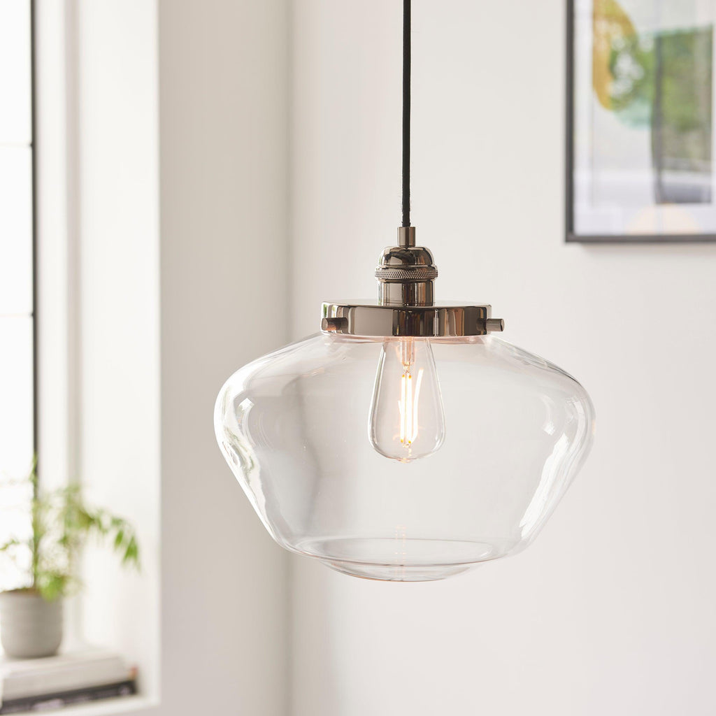 Introducing our stunning "School House" styled pendant light, crafted in a sleek bright nickel finish and featuring elegant clear glass. This versatile piece is perfect for illuminating your kitchen, adding charm above a breakfast bar, or creating a warm ambiance over your dining table. Whether you choose to hang it individually or in a striking trio, this pendant light makes a captivating centerpiece for your living room, effortlessly enhancing your decor. Plus, with a matching semi-flush option available, you can create a cohesive look throughout your home. Shop with confidence knowing that our hassle-free returns make your shopping experience worry-free. Illuminate your space with style today!| Adjustable Drop | 152cm/59.8" |