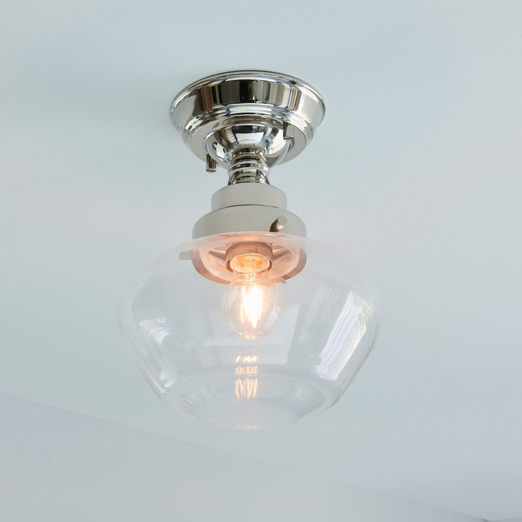 A timeless “school house” styled semi-flush in bright nickel with clear glass, ideal for the kitchen, above a breakfast bar or dining table. Hang individually or in a set of three. Matching pendants are also available.