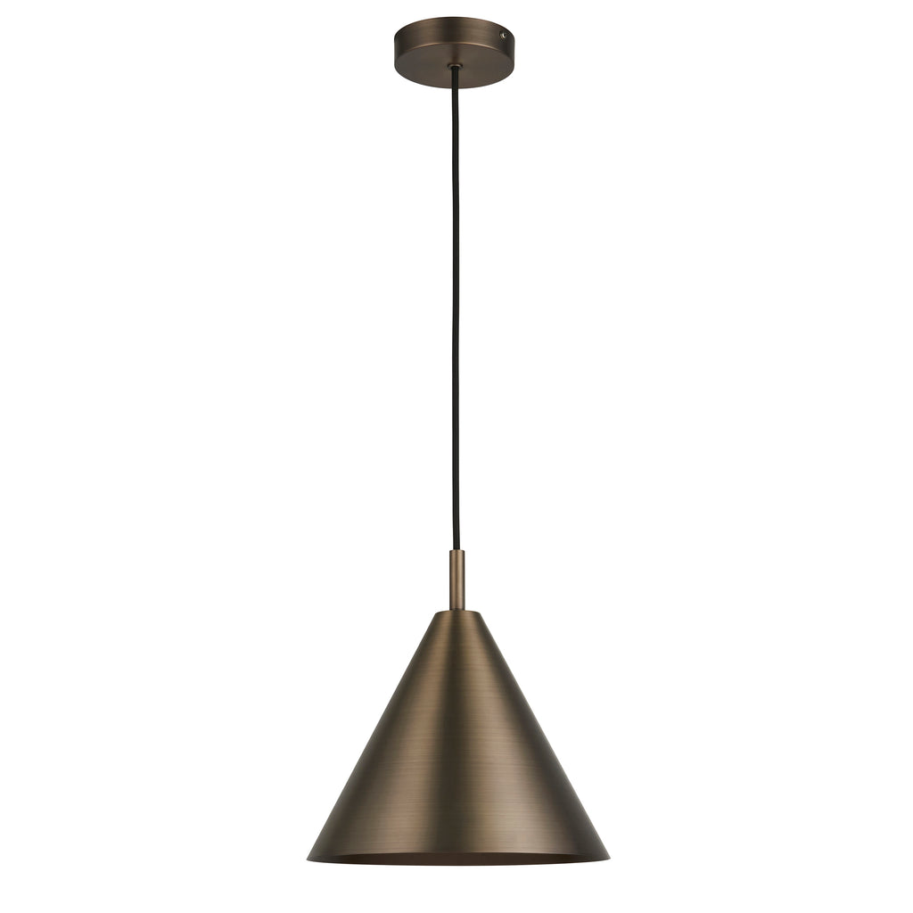 Modernise your interiors with this brushed antique bronze pendant, metalwork and inner shade. Ideal for over a dining table or kitchen island, this minimal design is a great fit for both modern and traditional homes. The 1.2 metre black fabric cable gives you the flexibility to place this pendant in the perfect spot. Finish the look with an E27 LED lamp. Matching items available.