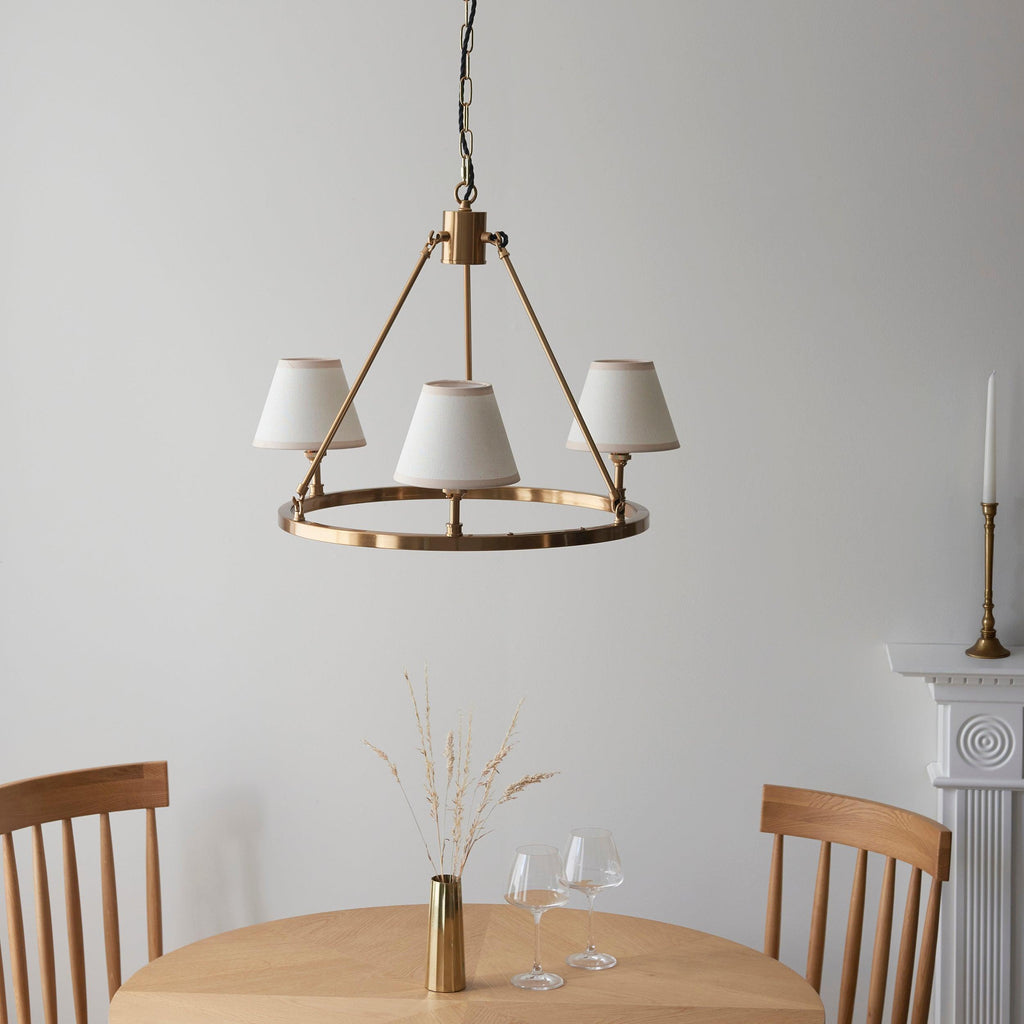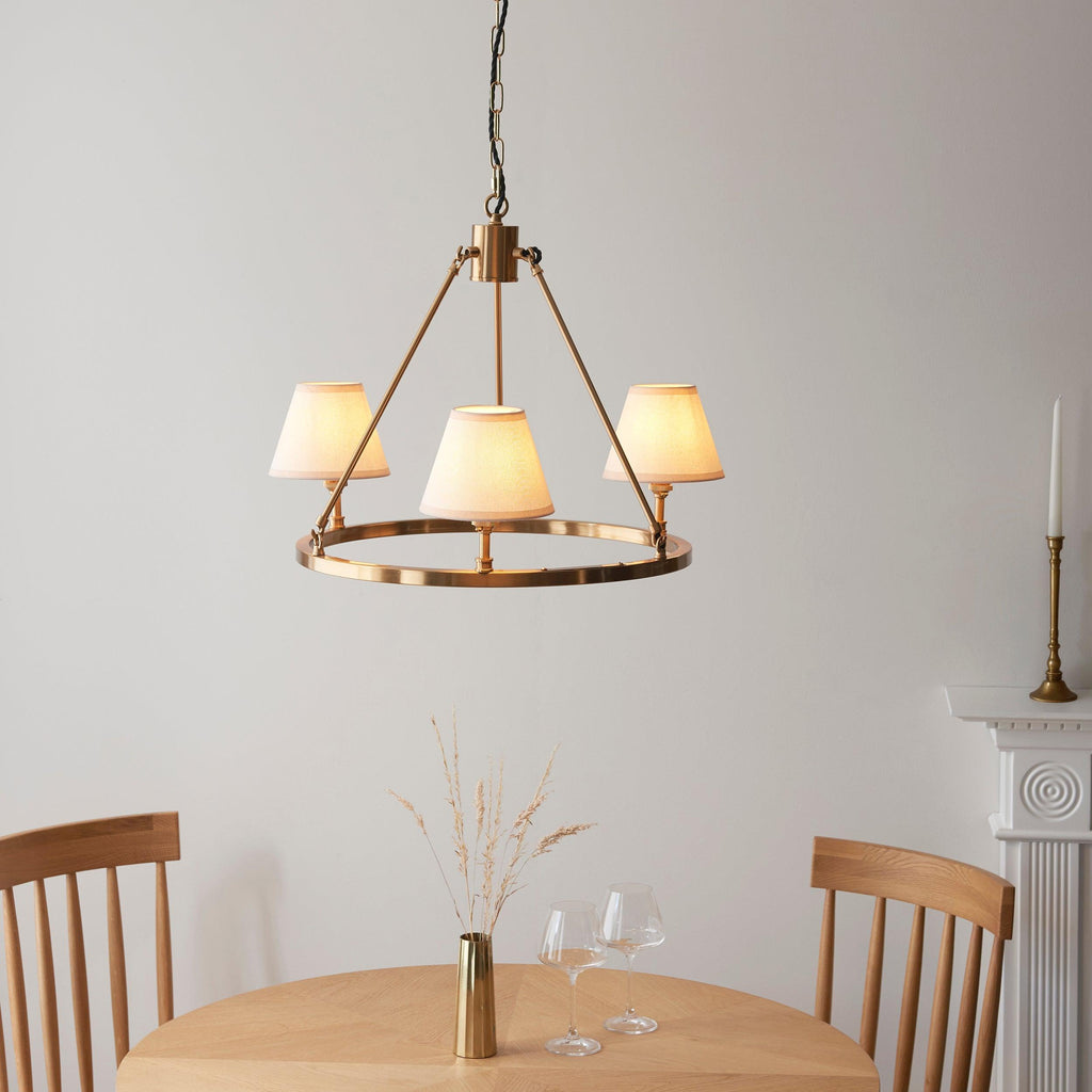 Elevate your home’s ambiance with the exquisite charm of our timeless hoop chandelier, masterfully crafted with an aged brass plate finish and authentic brass B22 lamp holders. This stunning piece is not just a light fixture; it's a statement of elegance and sophistication. The height-adjustable chain and twisted fabric flex offer versatility, allowing you to customize the perfect fit for your space. Adorned with three of our vintage & almond white 16cm Ivy shades, this chandelier exudes a classic allure that will captivate anyone who enters your home. Plus, it’s compatible with LED lamp bulbs, ensuring energy efficiency without compromising on style. Transform your living space into a haven of timeless beauty with a chandelier that promises to be the centrepiece of admiration. Don’t just light up a room—illuminate it with elegance.