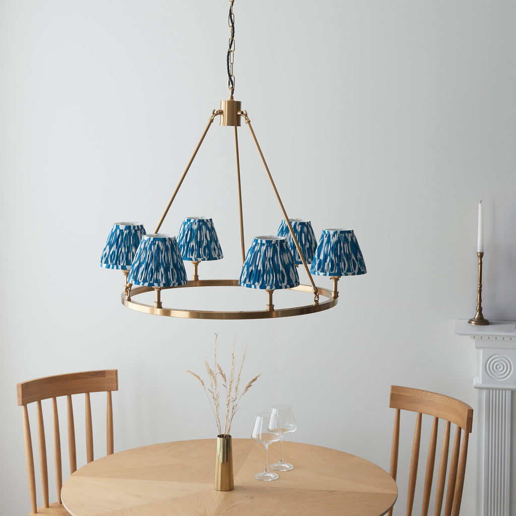 Illuminate your home with elegance and sophistication with our stunning hoop chandelier, expertly crafted to capture timeless beauty. The aged brass plate finish, paired with authentic brass B22 lamp holders, exudes a classic charm that seamlessly complements any décor. Designed with versatility in mind, the height-adjustable chain and twisted fabric flex allow you to customize the perfect fit for your space. This exquisite chandelier is completed with six vibrant marlin blue 16cm Ikat shades, adding a splash of colour and style that will make your room truly stand out. Plus, it's compatible with energy-efficient LED lamp bulbs, offering you the perfect blend of style and sustainability. Transform your home into a haven of light and luxury with this chandelier—a masterpiece you'll be proud to showcase. Don't miss the chance to elevate your living space with this timeless piece. Order now and let your home shine with unparalleled elegance.| Adjustable Drop | 214cm/84.3" |