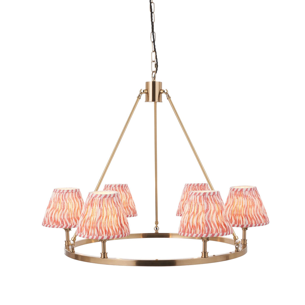 Illuminate your home with a touch of timeless elegance. Our exquisite chandelier, featuring a classic hoop design finished in an aged brass plate, is the perfect statement piece for any room. The authentic brass B22 lamp holders exude sophistication, while the height-adjustable chain and twisted fabric flex offer versatility to suit your space. This stunning chandelier is completed with six vibrant coral pink 16cm Ripple shades, creating a captivating focal point that blends tradition with modern flair. Designed to accommodate LED lamp bulbs, it ensures energy efficiency without compromising on style. Transform your home into a haven of luxury and charm with this chandelier—a masterpiece you'll be proud to showcase. Don't miss the opportunity to elevate your décor with this timeless addition.| Adjustable Drop | 214cm/84.3" |