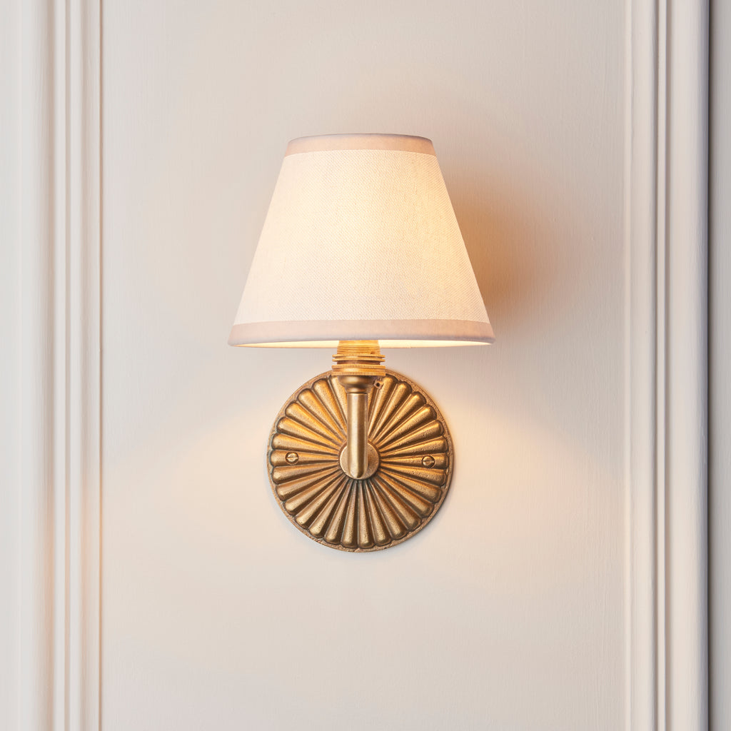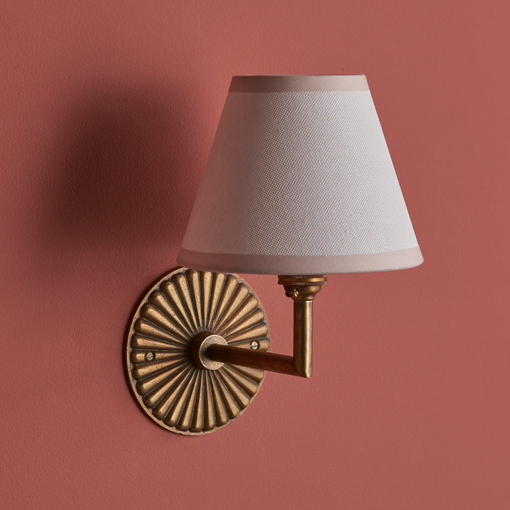 Classic in form and rich in character, this single B22 wall light features a beautifully sand-cast decorative backplate with a fan-fluted design that adds texture and vintage charm. The arm extends to support a tapered fabric shade with contrast colour edging, softly diffusing light to create a warm, inviting glow. Perfect for bedrooms, hallways, or living spaces, this piece blends artisan craftsmanship with timeless elegance.