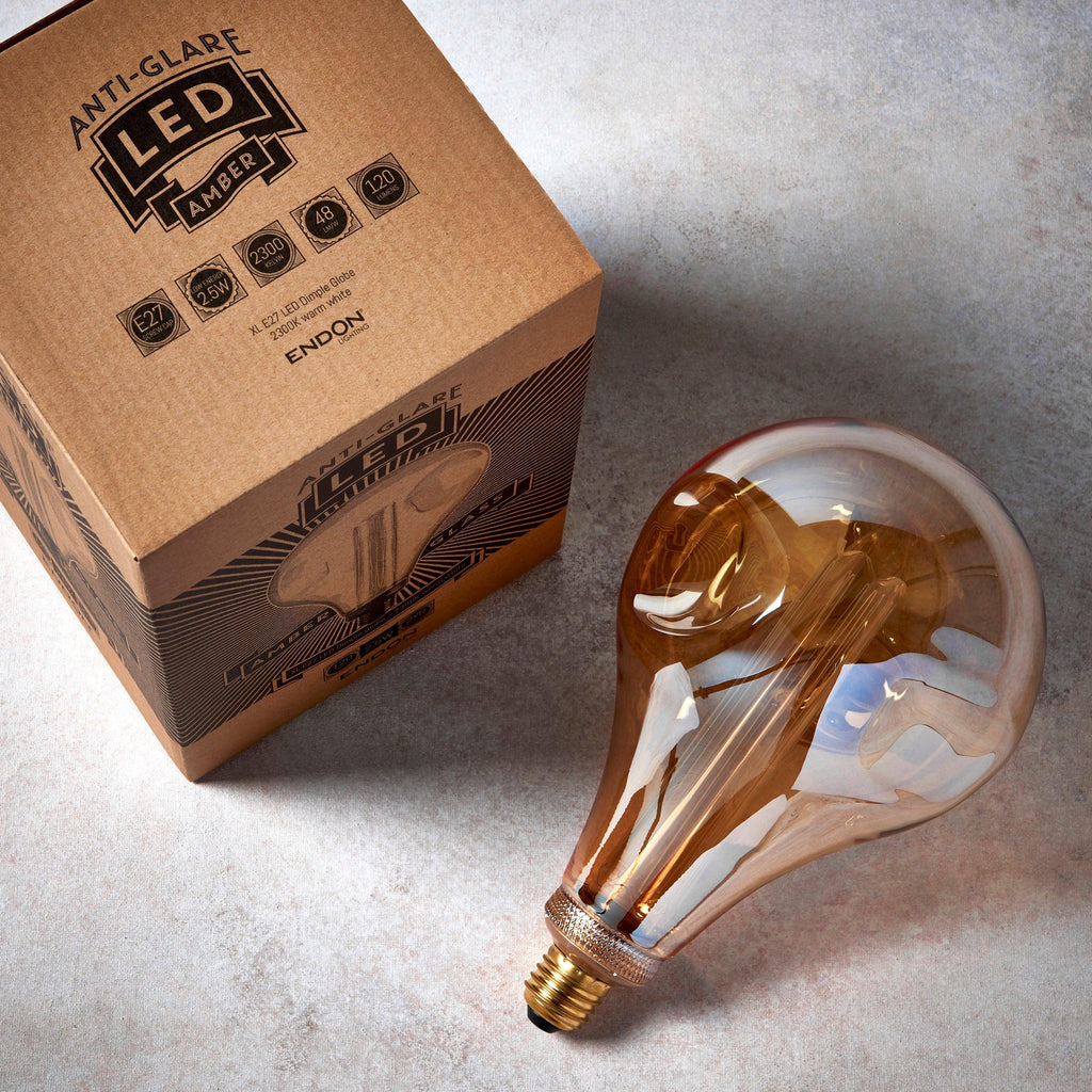 The perfect light accessory, this XL amber tinted glass anti-glare LED energy saving lamp has a subtle warm light output, without compromising on style for that authentic light effect. Featuring 'melted' style dimple glass effect and an internal etched acrylic cylinder to diffuse the light and reduce glare. The perfect addition to exposed light designs for today's stylish homes, less glare, still achieving that on trend bar, hotel look.