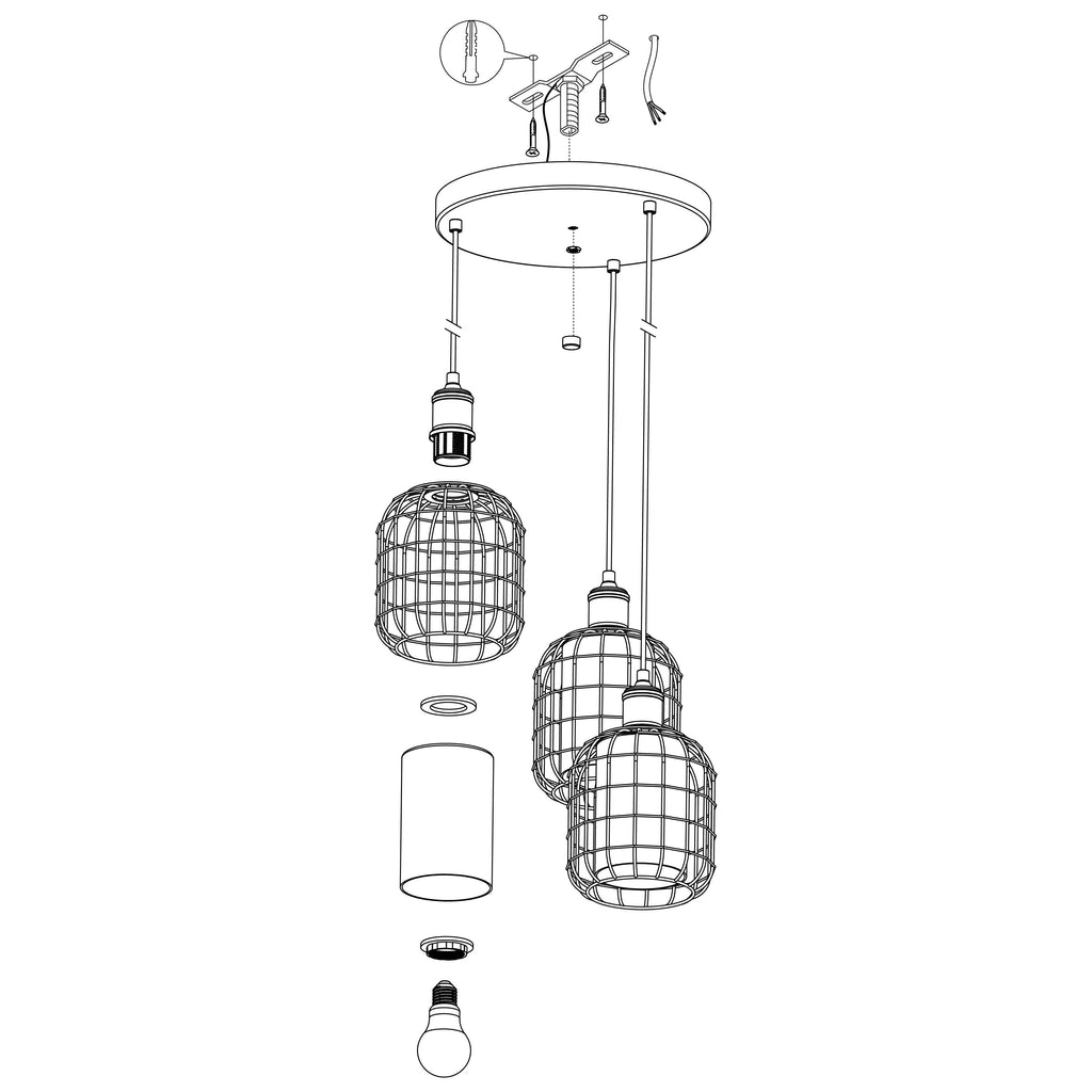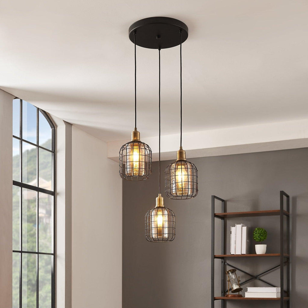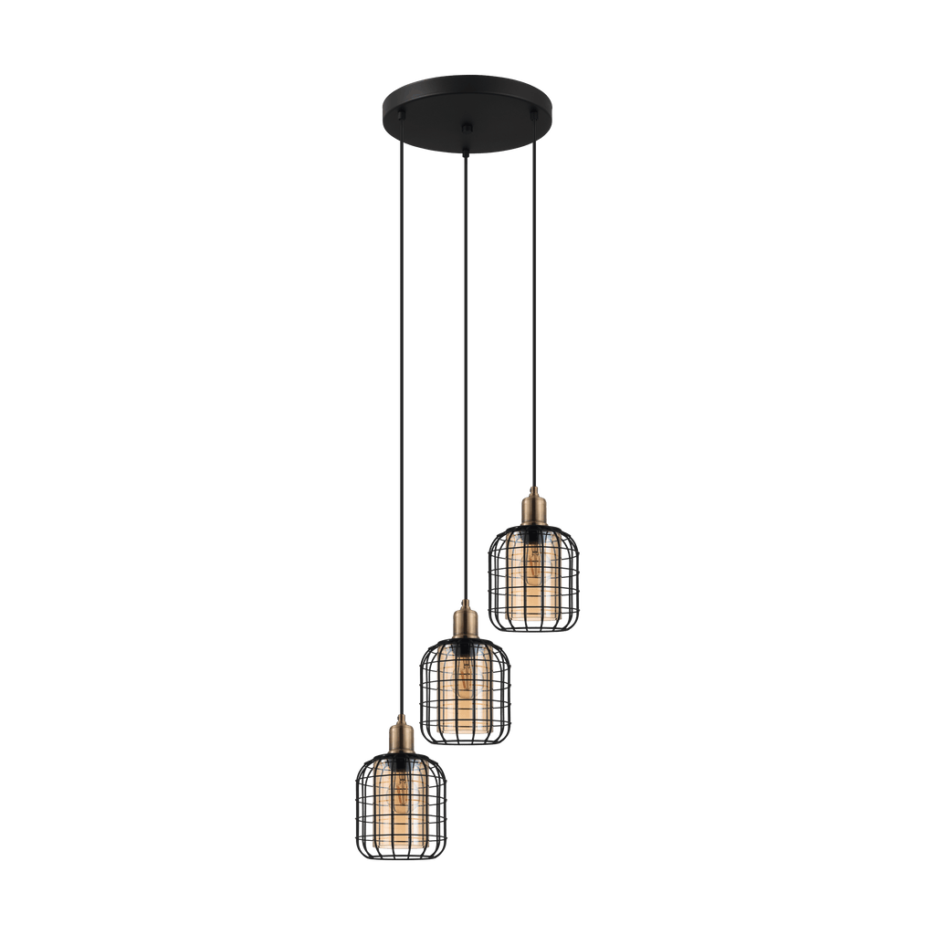 The CHISLE pendant light features three black wire lampshades with amber coated glass inner shades. Each shade is suspended at a different height from the black metal canopy. When the light is on, the caged design creates a fascinating play of light and shadow through the wireframe and the combination of elegant glass and rustic metal blends perfectly into modern loft-style interiors. The product creates statement lighting in any space, whether in the living room or above the dining room table. The product requires 3 x E27 lightbulbs that are not included.
