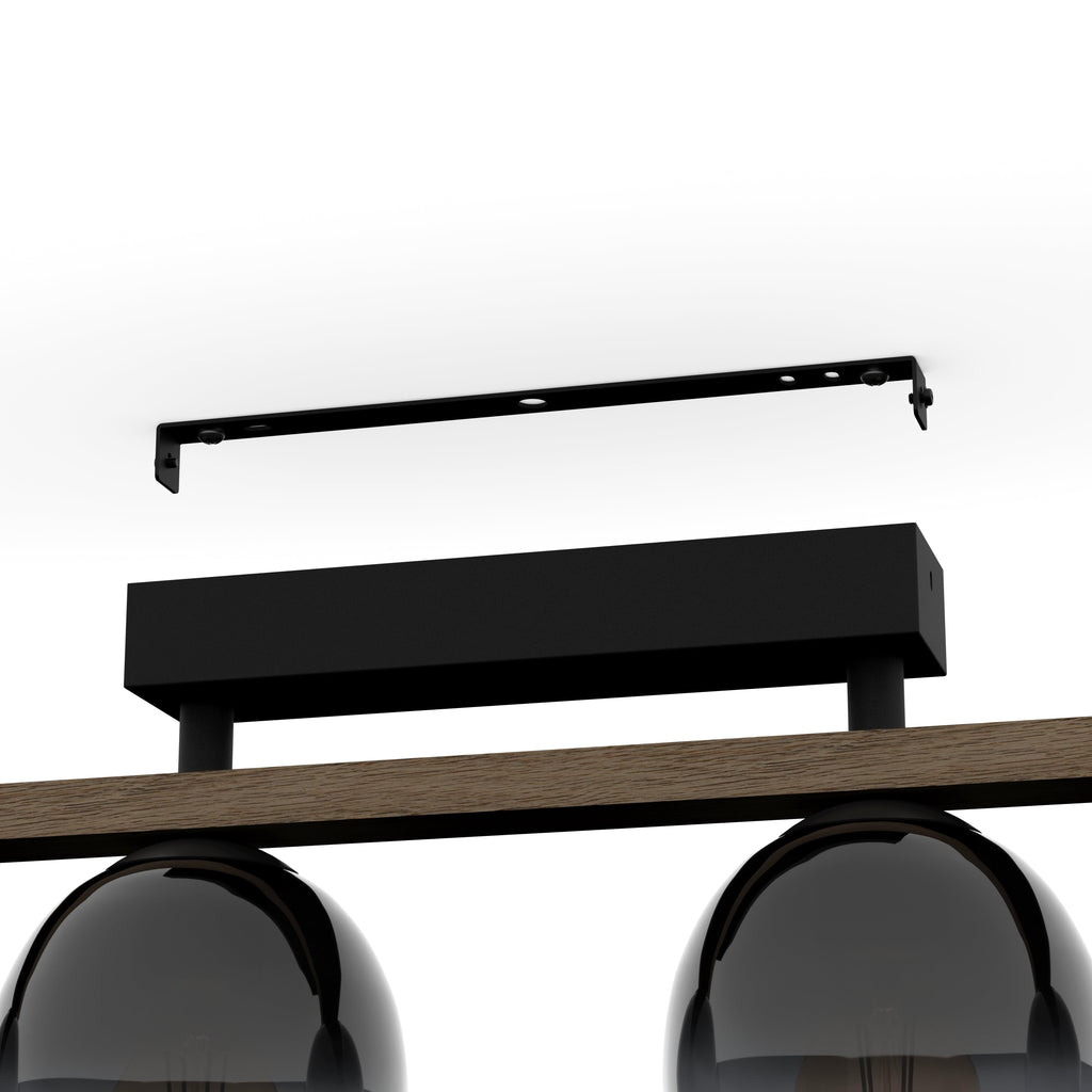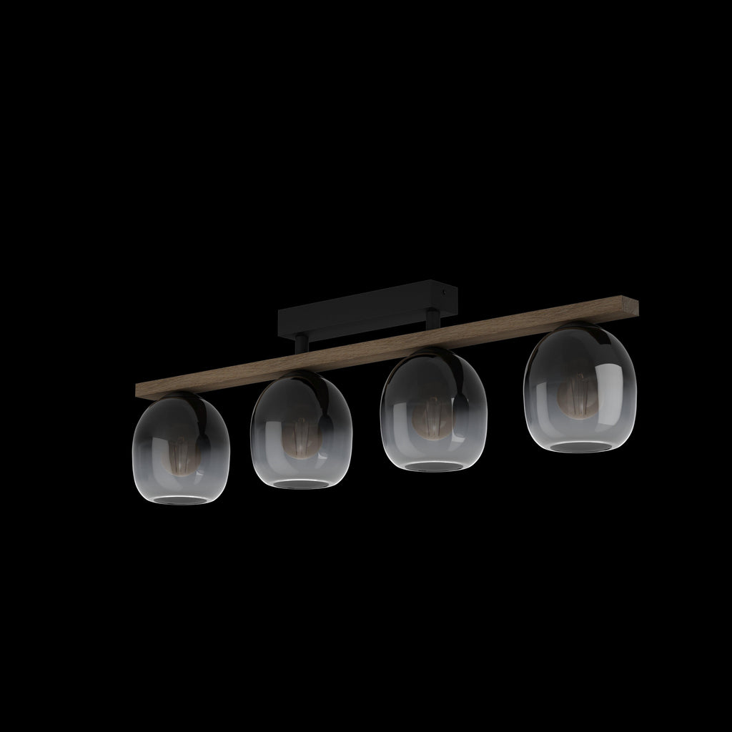 The FILAGO ceiling light features a pinewood beam in walnut-brown combined with four round glass lampshades that fade from black to transparent. The black metal base beautifully complements the ceiling light’s elegant look. The product blends seamlessly into modern interiors, providing welcoming lighting in any space, whether in the kitchen, living room, bedroom or hallway. Lightbulbs are not included. The product has E27 lamp holders and requires E27 lightbulbs.