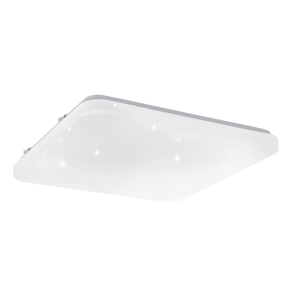 The FRANIA-S LED ceiling light features a square white plastic light panel with rounded corners and a white metal rear panel. When the light is on, the light shines through the cover, creating a sparkling effect like stars in the night sky. The integrated LEDs produce a pleasant warm white light. The ceiling light measures 33 x 33 cm and provides attractive lighting while integrating perfectly into modern-style living spaces, including kitchens, living rooms, bedrooms, hallways and nurseries.