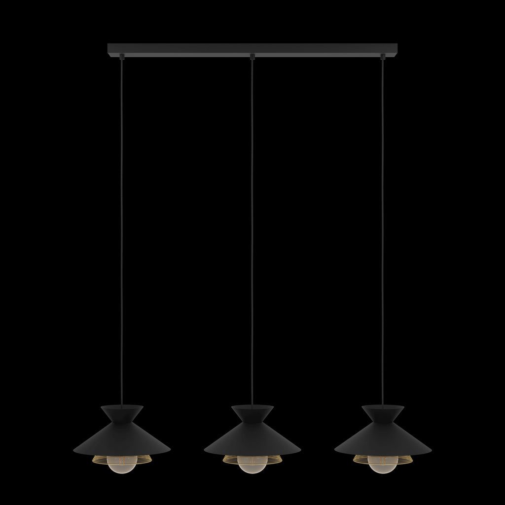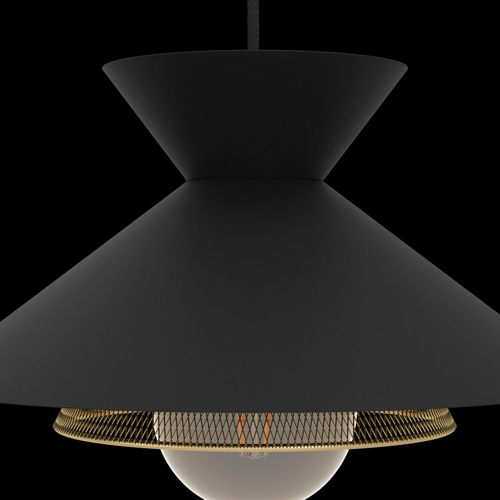 The GRIZEDALE pendant light features three black metal lampshades with an inner brass element, enhanced by a metal mesh design that creates a striking display of light and shadow once illuminated. With its Japanese-inspired umbrella shape and sleek black metal ceiling mount, the product is a perfect fit for modern spaces and a captivating centrepiece in living or dining rooms. The pictured filament lightbulb is not included. The product has E27 lamp holders and requires E27 lightbulbs.