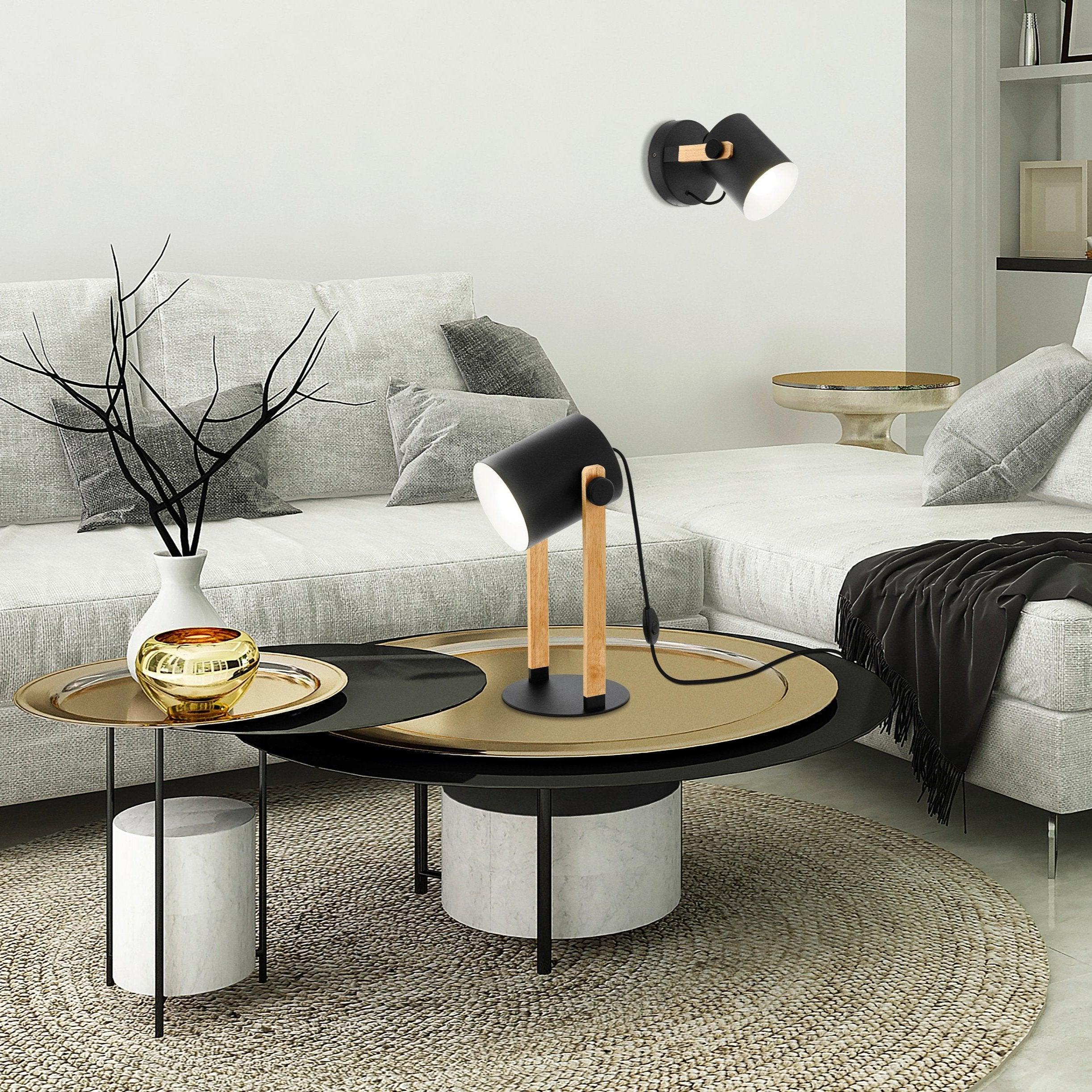 The HORNWOOD wall and ceiling light feature a natural pinewood frame with a pivoting black metal lampshade with an inner cream lining. The wall-mounted spotlight has a black metal mount, which complements the light’s compelling mix of wood and metal. The product blends seamlessly with modern interior design styles and can be used as a ceiling light. The pivoting head allows you to adjust the light to accentuate individual areas of the room, whether in the living room, the bedroom, the hallway or the dining room. The product requires 1 x E27 lightbulb, which is not included.
