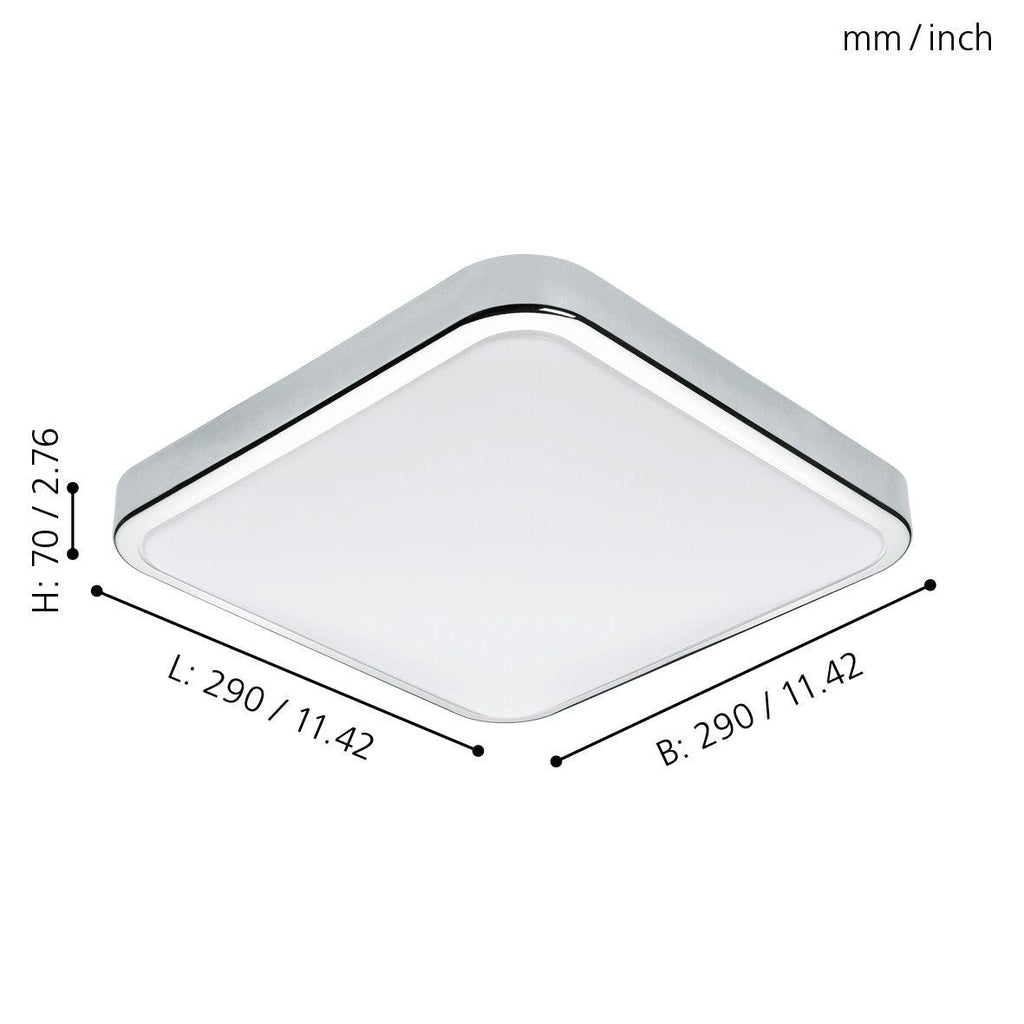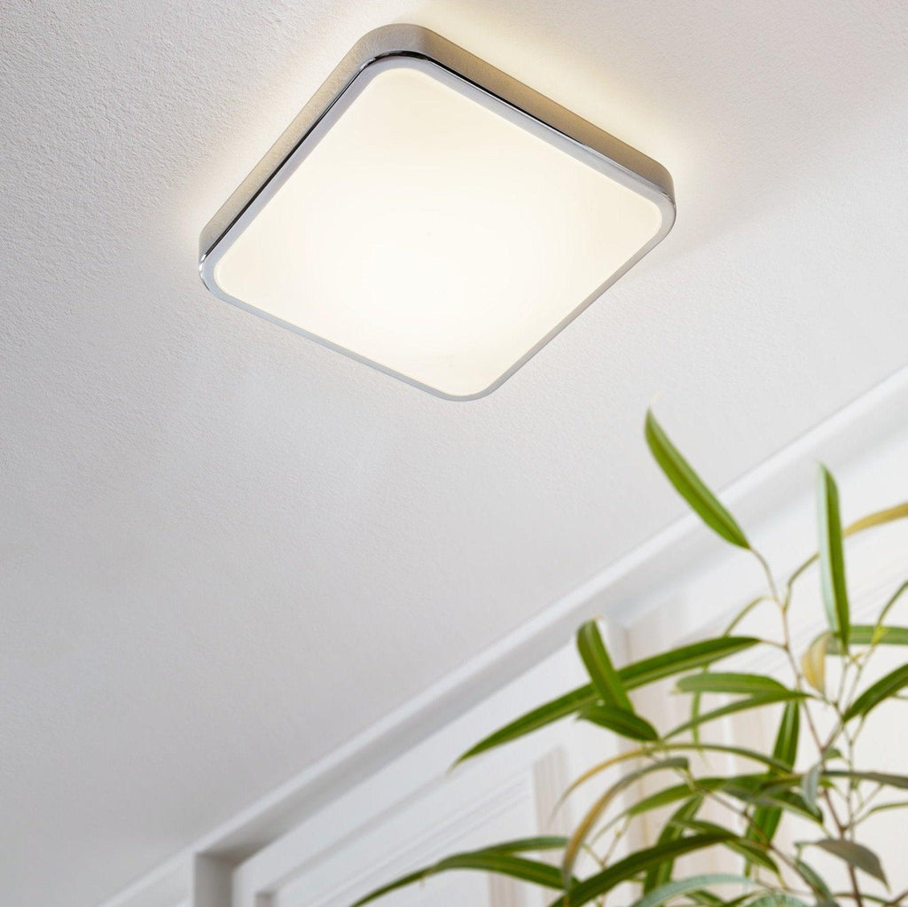 The MANILVA 1 LED ceiling light features a chrome-coloured square metal body with rounded corners paired with a white plastic light panel. The product has IP44 protection against spray water and is suitable for use in the bathroom. The integrated LEDs produce a pleasant warm white light. The light works particularly well in modern living spaces, including kitchens, living rooms, bedrooms and hallways.
