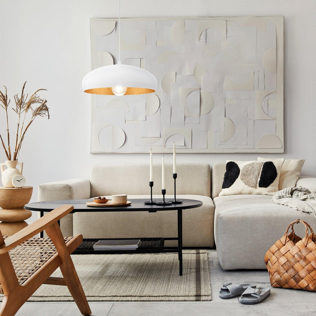 The MOGANO 1 pendant light has a round white metal lampshade with a copper-coloured inner finish. The pendant light blends seamlessly into modern interiors and offers a perfect lighting solution for the living room or above the table in the dining room. The pictured filament lightbulb is not included. The product has an E27 lamp holder and requires an E27 lightbulb.