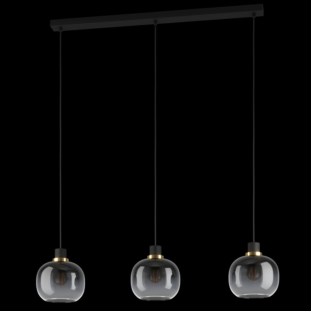 The OILELLA pendant light features three spherical glass lampshades with an attractive black and grey colour scheme. Each lampshade has a black metal accent and features a brushed brass decorative element. With its appealing tones, the pendant light will light up your space beautifully, whether in the living room or over a long table in the dining room. The pictured filament lightbulbs are not included. The product has E27 lamp holders and requires E27 lightbulbs.