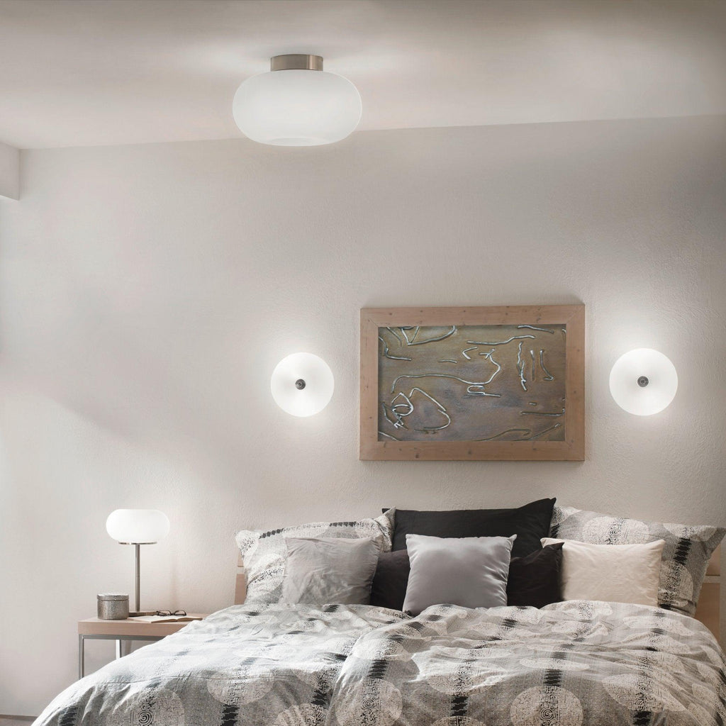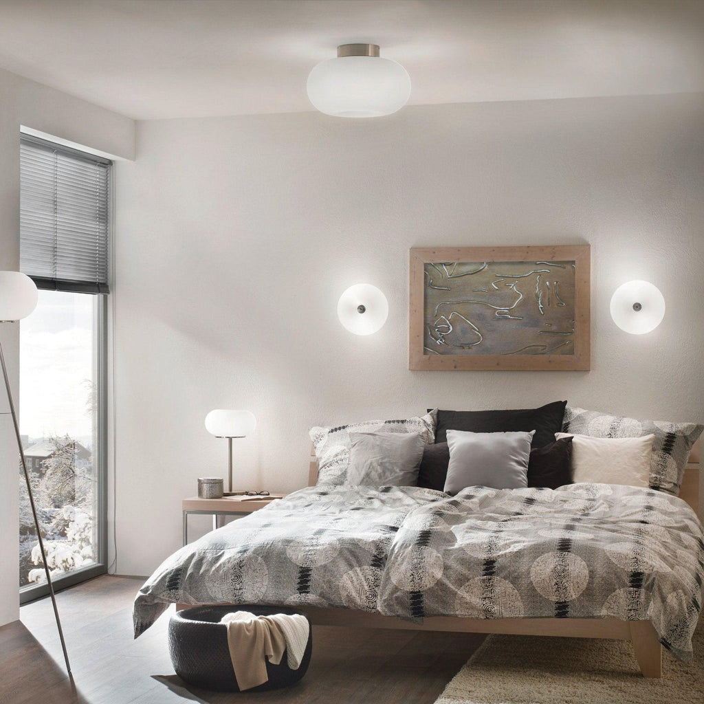 This wall or ceiling luminaire from the series OPTICA is made of satin nickel steel and white, opal-matte glass. The spotlight needs two E27 light bulbs.