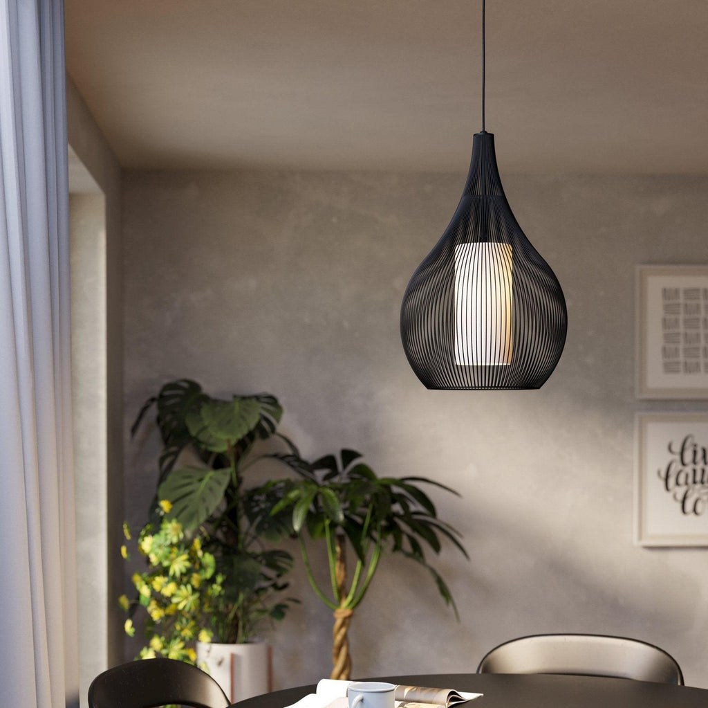 The RAZONI 1 single pendant light is made of an organically shaped, black wire shade, which is combined with an internal white glass cylinder. The 32.5 cm lampshade creates fascinating plays of light and shadow as soon as the luminaire is switched on. The pendant light's monochrome design complements modern and Scandinavian interior styles and offers ambient lighting in the living room or above the dining room table. The product has an E27 lamp holder and requires 1 x E27 lightbulb, which is not included.