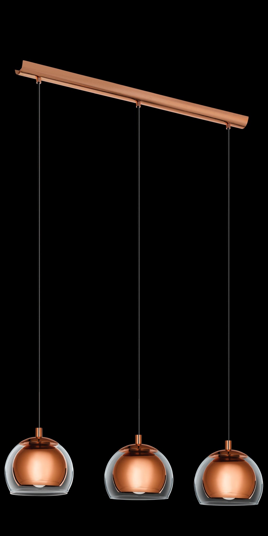 The ROCAMAR pendant light has three spherical clear glass shades, each surrounding an inner metal cylinder in a copper finish. The design has a rectangular copper-coloured metal canopy. The elegant pendant light features a simple design and superbly complements modern interiors, providing stylish lighting in the living room or dining room above the dining table. Lightbulbs are not included. The product has E27 lamp holders and requires E27 lightbulbs.