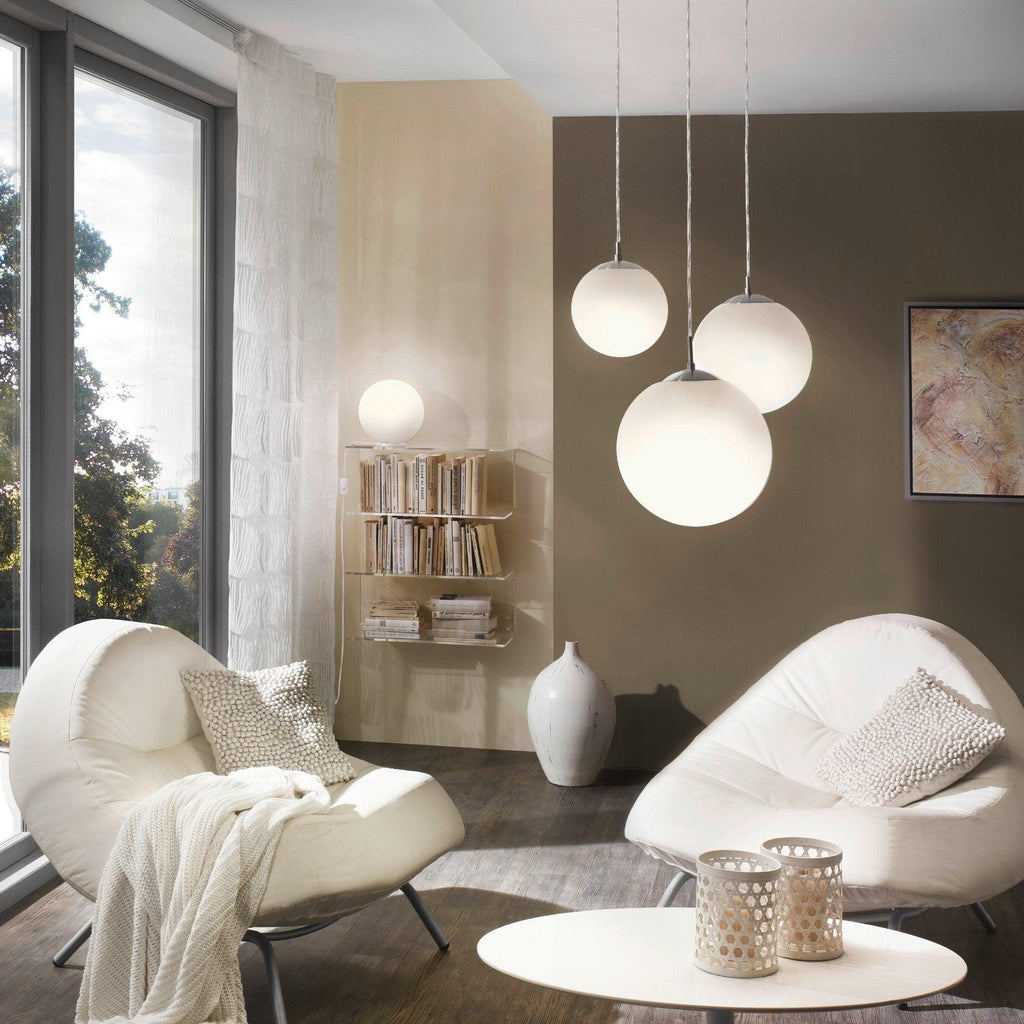 The RONDO pendant light features a white matte opal glass sphere suspended from a round satin nickel metal canopy. With its simple design, the pendant light blends seamlessly with various interior design styles and provides cosy lighting for your home, whether in the living room or dining room. The lightbulb is not included. The product has an E27 lamp holder and requires an E27 lightbulb.