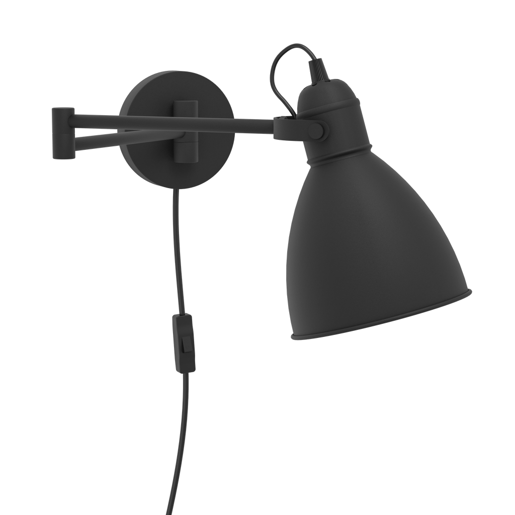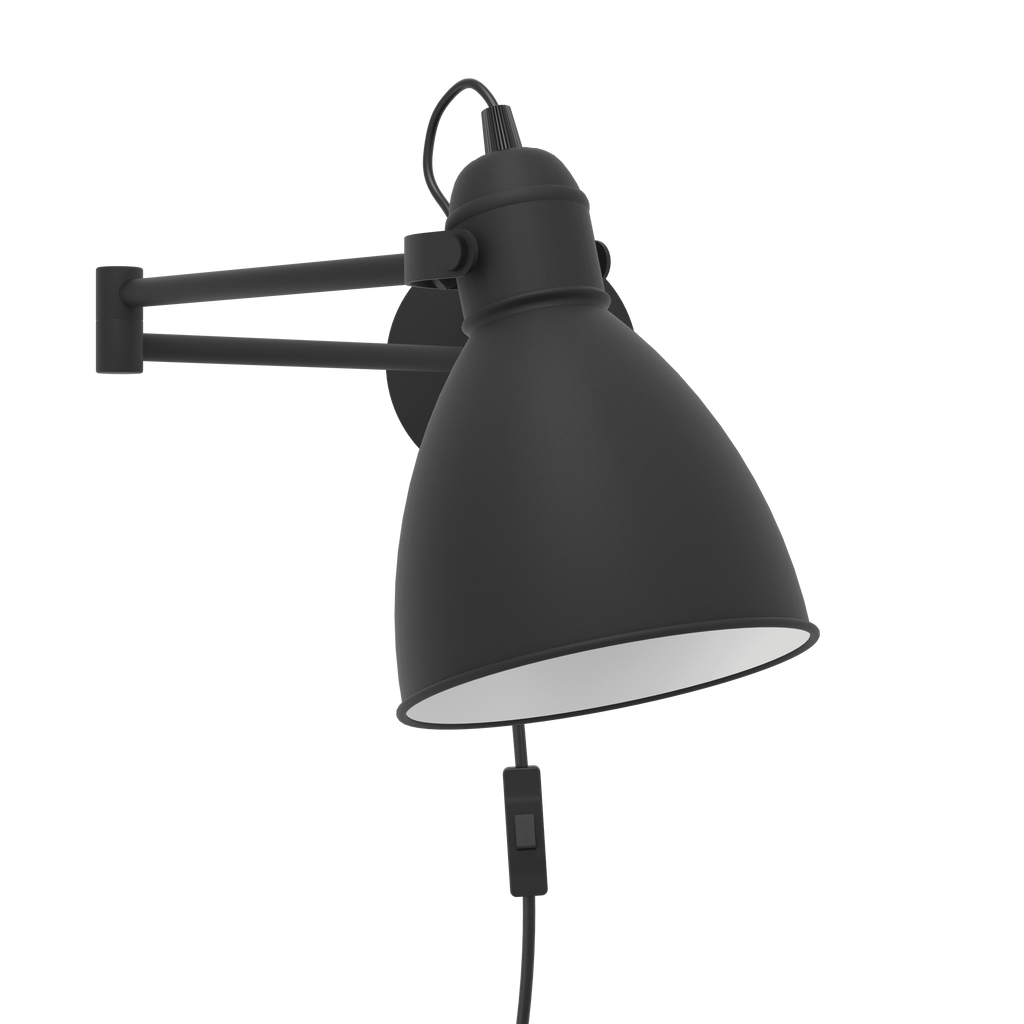 The SAN PERI wall light has a black metal finish and features an adjustable arm and head. The lampshade has a white inner finish and produces excellent lighting, while the pivoting arm can adjust the light to accentuate individual areas of the room. The wall light can switch on and off easily using the in-line switch. The minimalist design blends seamlessly with modern, vintage and industrial-style interiors, providing ideal lighting for your home. The pictured filament lightbulb is not included. The product has an E27 lamp holder and requires an A60 E27 lightbulb.
